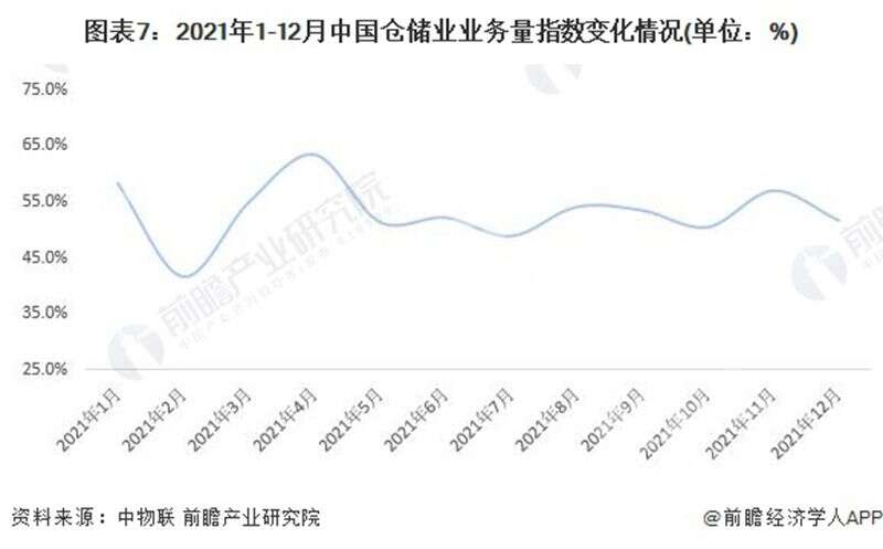 根據(jù)中國物流與采購聯(lián)合數(shù)據(jù),2021年1-12月,中國倉儲業(yè)務(wù)量指數(shù)均值為53.1%,同比增長0.7%,整體位于枯榮線(50%)以上,反映出倉儲行業(yè)需求在企業(yè)生產(chǎn)活動加快和消費品需求保持回升的背景下,仍保持較為穩(wěn)定的態(tài)勢。